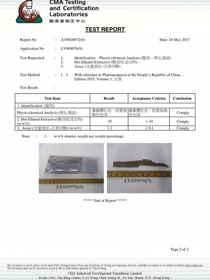 香港中華廠商會檢定中心的報告檢定山王沉香技術所產生的沉香含油量超過35%,可用於傳統中藥配方。產出還通過殘餘農藥測試,品質有保證。